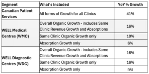 - WELL recently announced that it achieved quarterly revenue of over $110 million as part of its Canadian Patient Services business, reflecting growth of 41% on a YoY basis. WELL is pleased to provide enhanced disclosure on its organic growth metrics, including detailed breakdowns of same-clinic growth and absorption-driven organic growth.